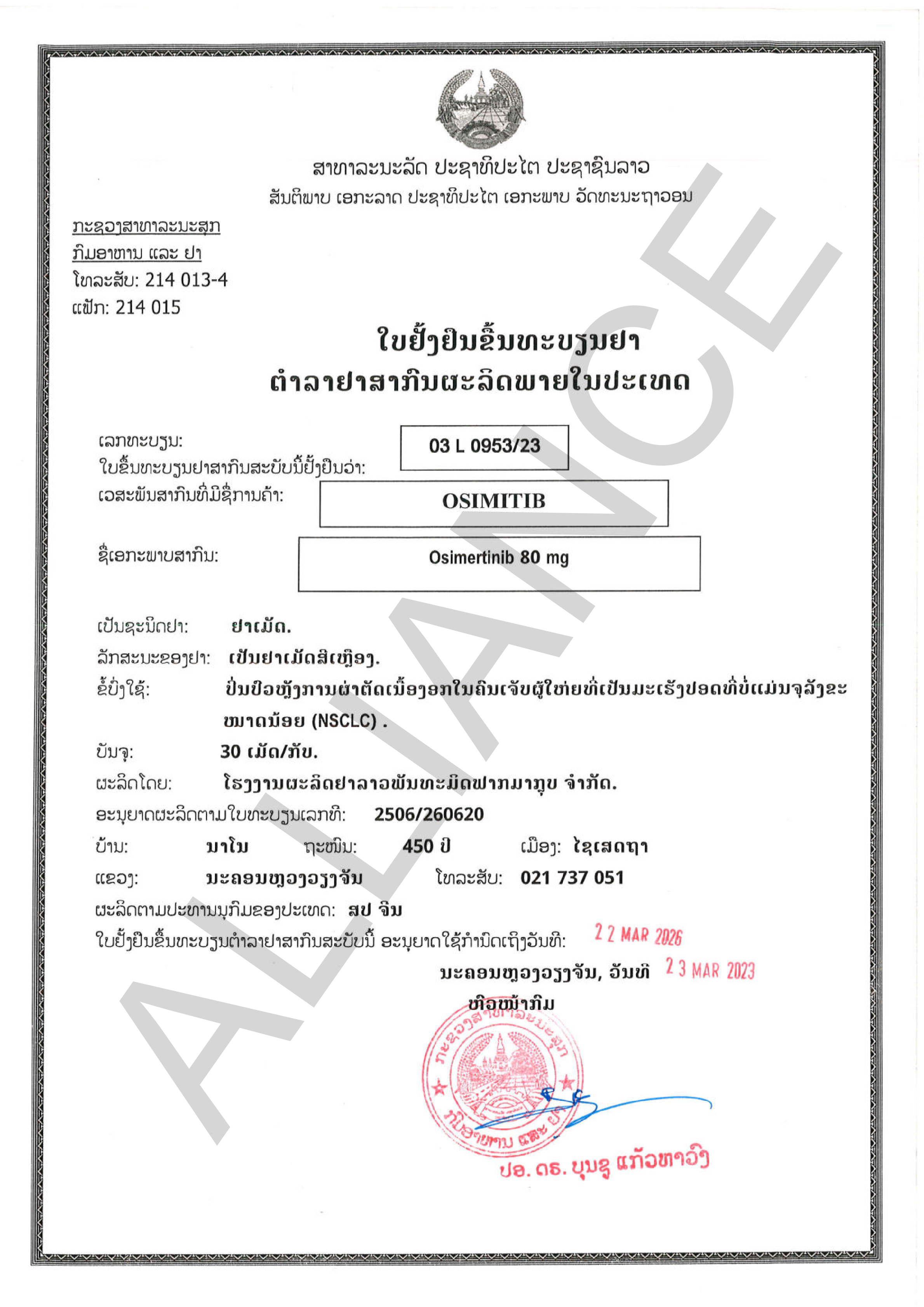 | 适用症 | 适用于肿瘤有表皮生长因子受体(EGFR)外显子19缺失或21L858R突变的成人非小细胞癌(NSCLC)患者,在肿瘤切除术后的辅助治疗;转移性EGFR-T790M突变阳性NSCLC成人患者治疗。 | ||