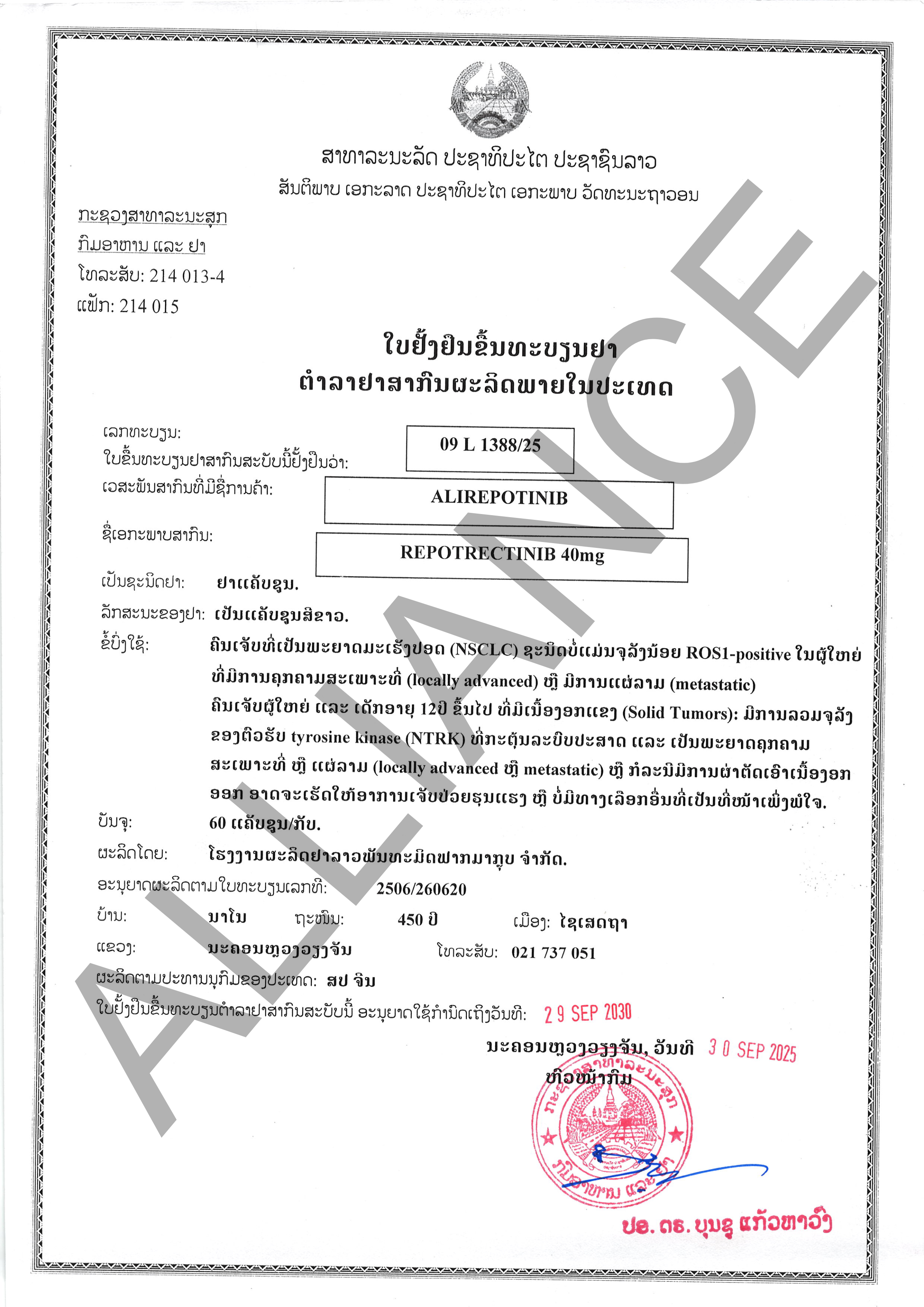| 适用症 | 1.患有局部晚期或转移性ROS1-阳性非小细胞肺癌癌症(NSCLC)的成年患者。 2.12岁及以上患有实体瘤的成人和儿童患者: 具有神经营养酪氨酸受体激酶(NTRK)基因融合 及局部晚期或转移性,或手术切除可能导致严重发病率。 并且在治疗后疾病进展或没有令人满意的替代方案 | ||