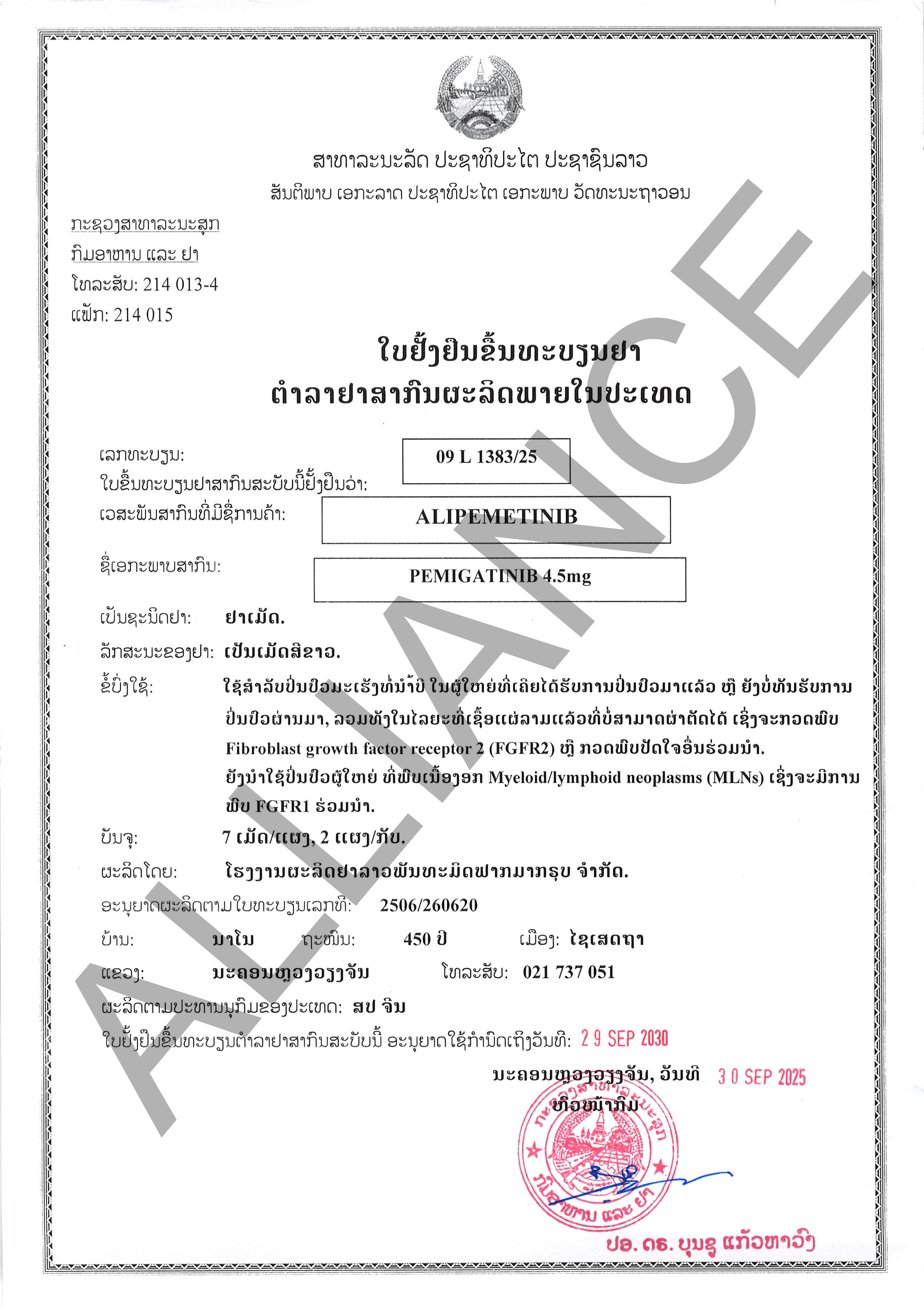 | 适用症 | 用于既往接受过治疗,无法切除的局部晚期或检测到具有成纤维细胞生长因子受体2(FGFR2)融合或其他重排的转移性胆管癌的成人; 用于治疗复发或难治性伴FGFR1重排骨髓/淋巴肿瘤(MLNs)的成人。 | ||
